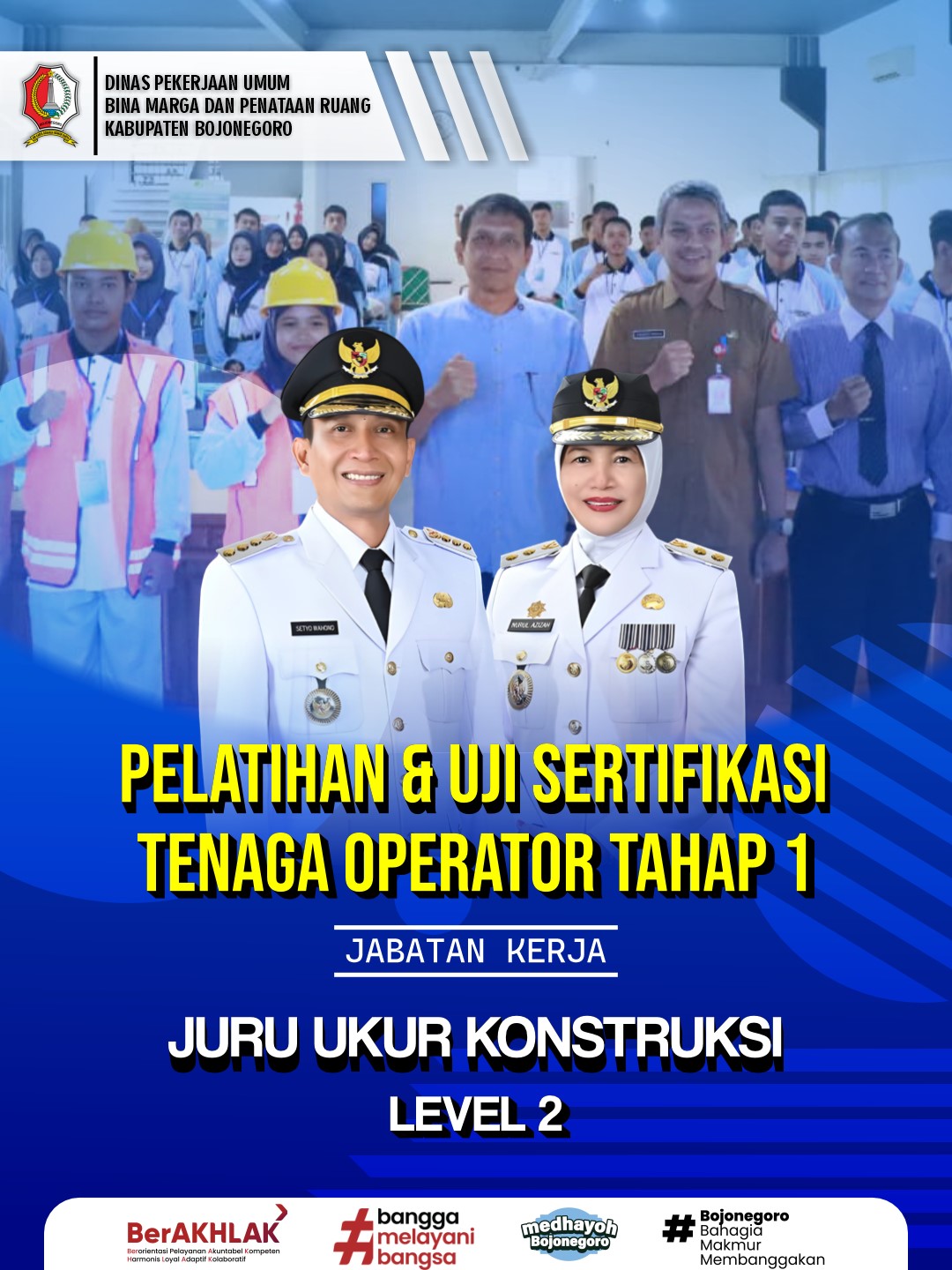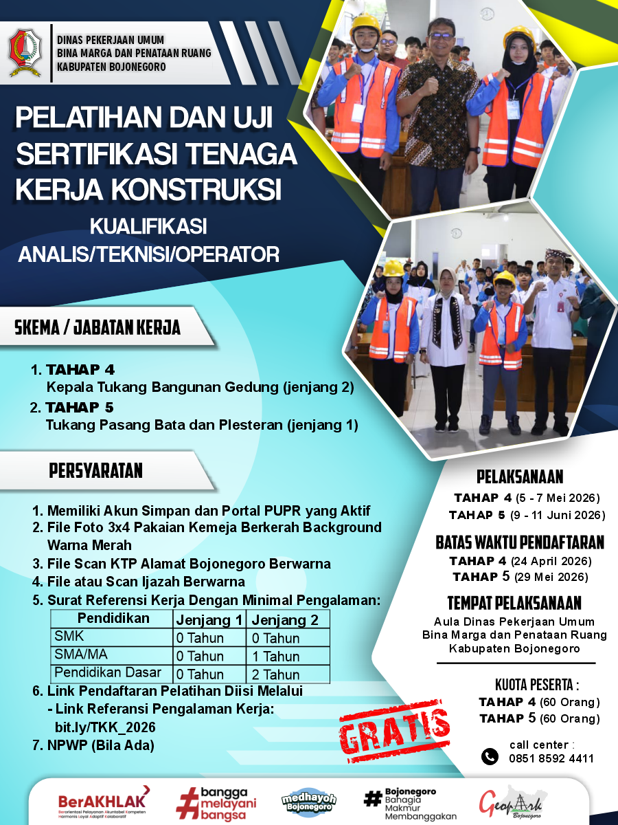 Dalam rangka meningkatkan kompetensi dan profesionalisme tenaga kerja konstruksi di Kabupaten Bojonegoro, Pemerintah Kabupaten Bojonegoro melalui Dinas Pekerjaan Umum Bina Marga dan Penataan Ruang (DPU...
