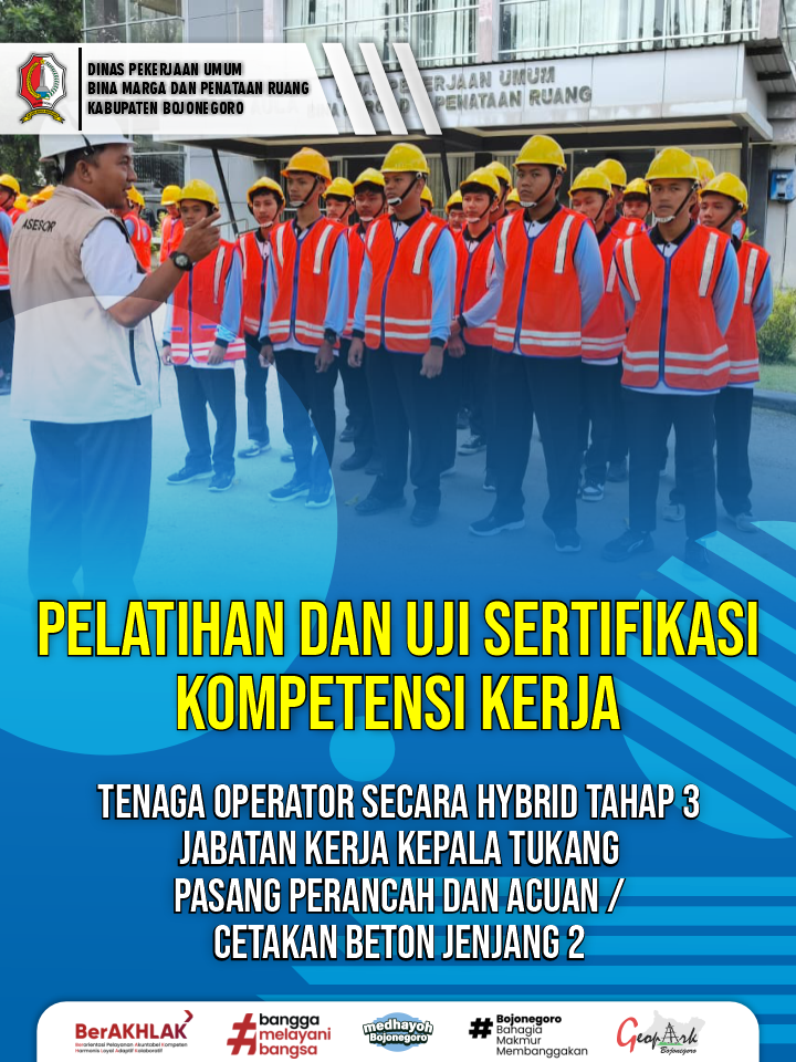 Pemerintah Kabupaten Bojonegoro melalui Dinas Pekerjaan Umum Bina Marga dan Penataan Ruang kembali menyelenggarakan Pelatihan dan Uji Sertifikasi Kompetensi Kerja Tenaga Operator Tahap 3 untuk jabatan kerja Kepala Tukang Pasang Perancah dan Acuan/Cetakan Beton Jenjang 2, yang dilaksanakan pada tanggal 14–16 April 2026. Kegiatan ini diikuti oleh 67 peserta dari SMKN 2 Bojonegoro jurusan Teknik Konstruksi dan Perumahan (TKP) sebagai bagian dari upaya peningkatan kualitas sumber daya manusia di sektor konstruksi.